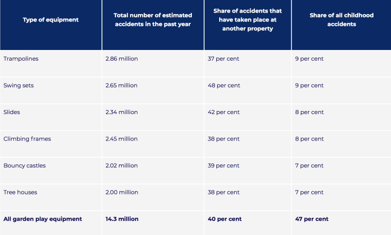 Millions of children are seriously injured in the garden every year which is a clear indication that parents need constantly reminding that the garden can be a danger zone. According to a report by Churchill insurance 21 per cent of parents (7.1 million) have had their child injured either at home or at someone else’s property over the past year. The same reports states that the leading cause of outdoor injury amongst children is garden play equipment, such as slides, swings and trampolines, accounting for nearly half (47 per cent) of injuries. Below is a table containing the most common garden play injuries sustained by children in the past year.